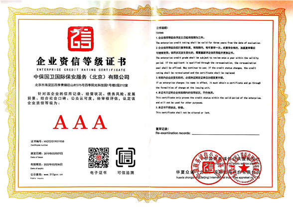 企業(yè)信用等級(jí)證書(shū)AAA級(jí)